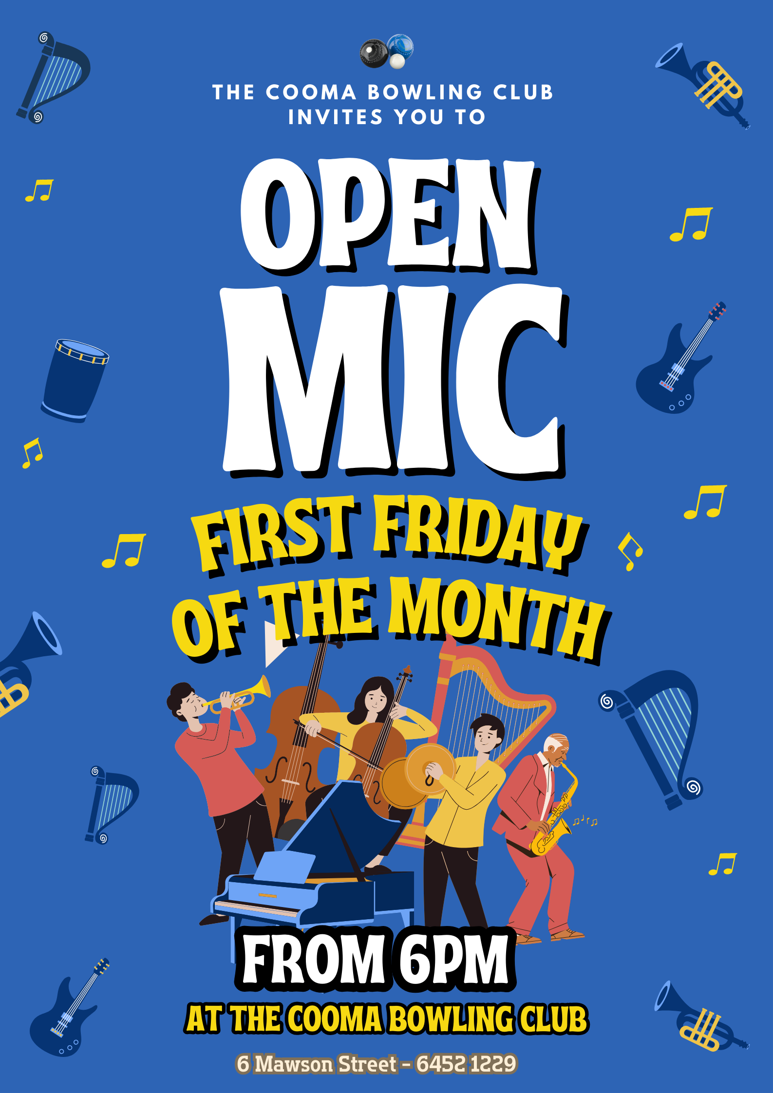 The Cooma Bowling Club Open Mic Night is the perfect opportunity for musicians, poets, comedians, and performers of all kinds to take the stage and share their skills with an appreciative audience. Open Mic night is the first Friday of every month from 6pm.
