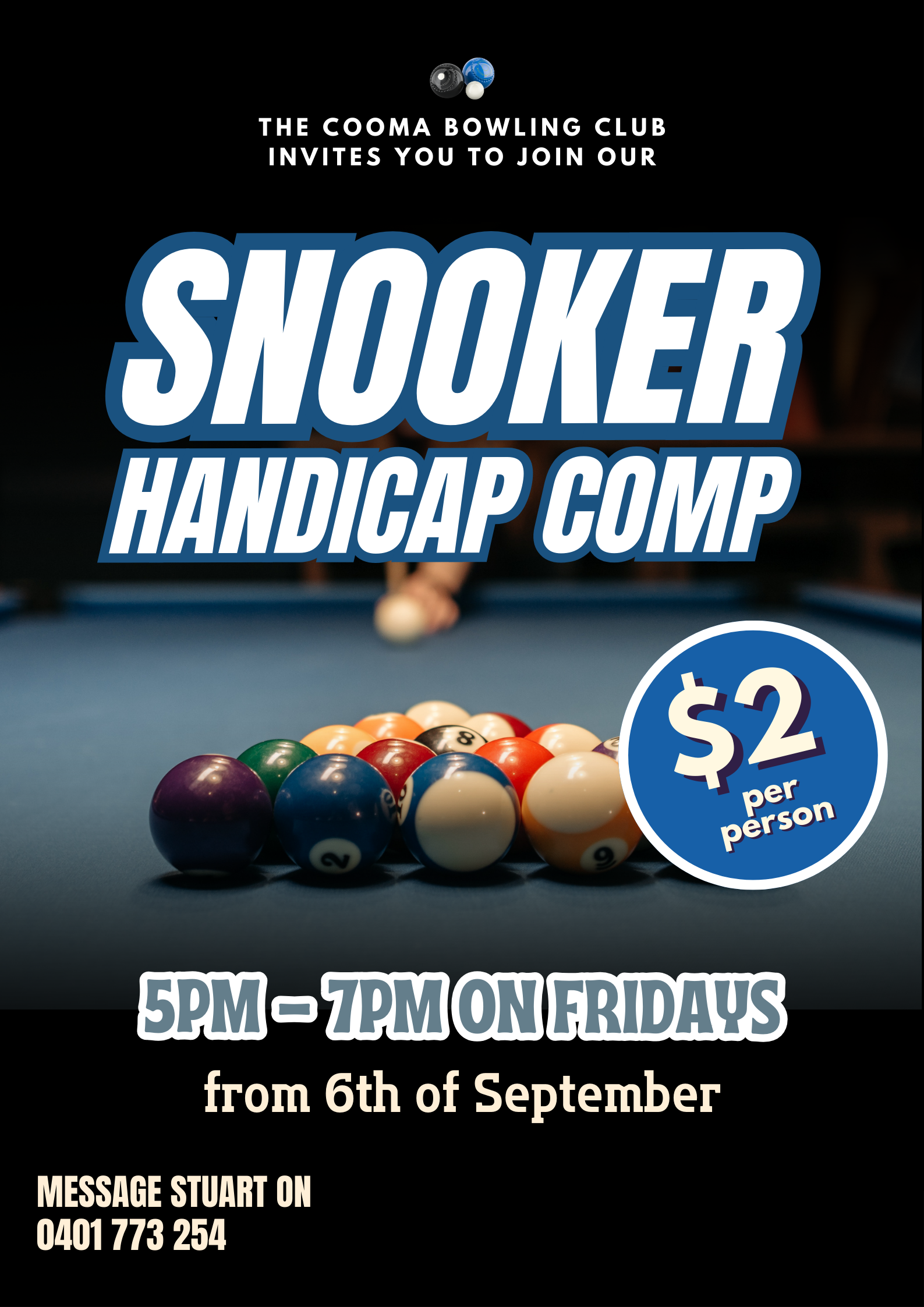 We have a Handicap Snooker competition starting on 6 September. Every Friday from 5pm- 7pm. Just $2 per person every week. Come and use our two wonderful Snooker Tables at your own convenience during the week to practice.