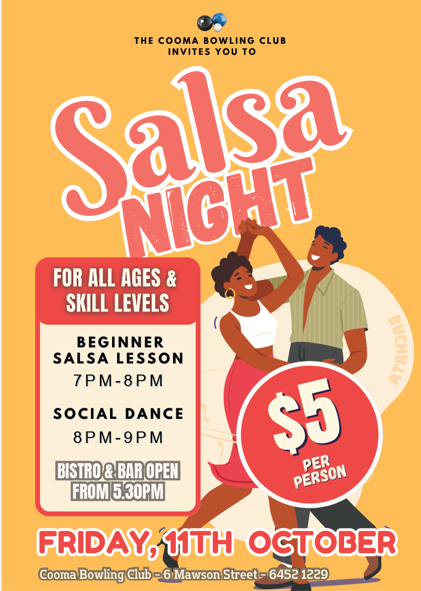 Join us for a salsa night with a beginner lesson lead by Becky from Kokoloco in Canberra starting at 7pm and social dancing from 8pm. $5 per head. Bistro opens for meals at 5.30pm.